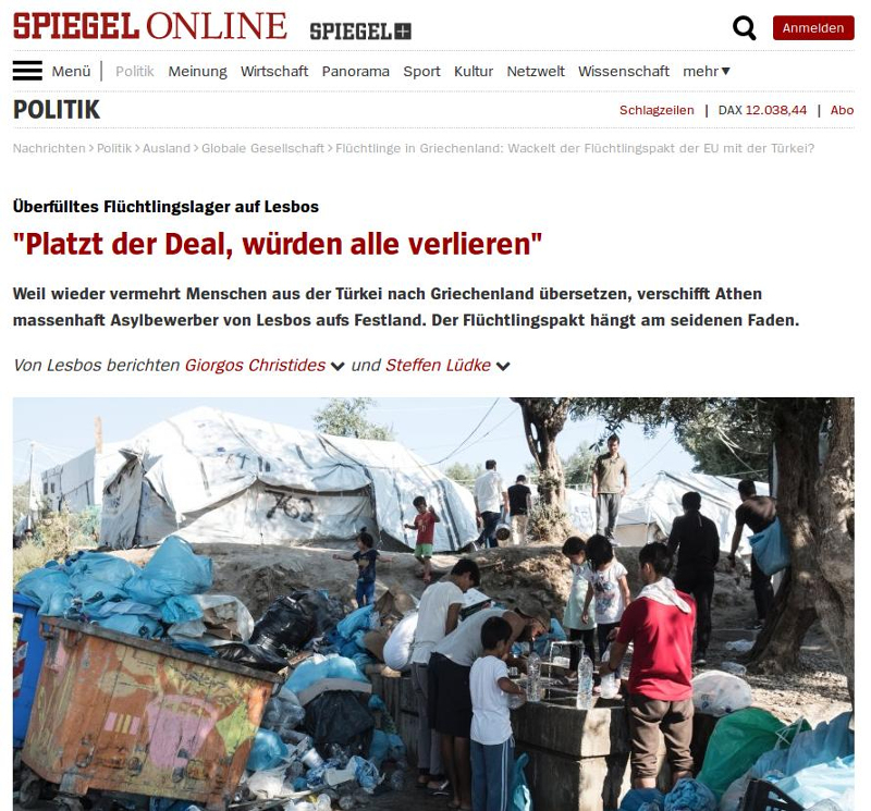 «Η Μόρια έγινε σύμβολο των καταστροφικών συνθηκών στα εξωτερικά σύνορα της Ευρώπης. Σχεδόν 10.400 αιτούντες άσυλο συνωστίζονται στον κατάμεστο καταυλισμό, που κανονικά μπορεί να φιλοξενήσει έως 3.000 άτομα. Πολλοί κατασκηνώνουν σ’ έναν ελαιώνα εκτός του καταυλισμού, οι τουαλέτες του οποίου επί μέρες δεν διέθεταν νερό. Αυτό που εκτυλίσσεται τώρα στον καταυλισμό στη Λέσβο ξεκίνησε την περασμένη Πέμπτη, όταν έφθασαν μέσα σε μια ώρα 13 φουσκωτά σκάφη με πρόσφυγες. Πολλοί Έλληνες θυμήθηκαν το 2015 και το 2016», αναφέρει το Spiegel θυμίζοντας ότι την ίδια μέρα είχε πάει ο Κυριάκος Μητσοτάκης στο Βερολίνο με το προσφυγικό ένα από τα θέματα στην ατζέντα των επαφών με την Άνγκελα Μέρκελ και την ελληνική πλευρά να κατηγορεί την Τουρκία ότι παραβιάζει τη συμφωνία με την ΕΕ χαλαρώνοντας τους ελέγχους για να δείξει στη νέα ελληνική κυβέρνηση πόσο εξαρτώμενη είναι από τις διαθέσεις της Άγκυρας με φόντο την ελληνοτουρκική κόντρα για τους υδρογονάνθρακες στην ανατολική Μεσόγειο και για να πιέσει την Ένωση να τηρήσει τα υπεσχημένα -άρση της υποχρεωτικής βίζας για τους Τούρκους και χρήματα για τους Σύρους πρόσφυγες στην Τουρκία.