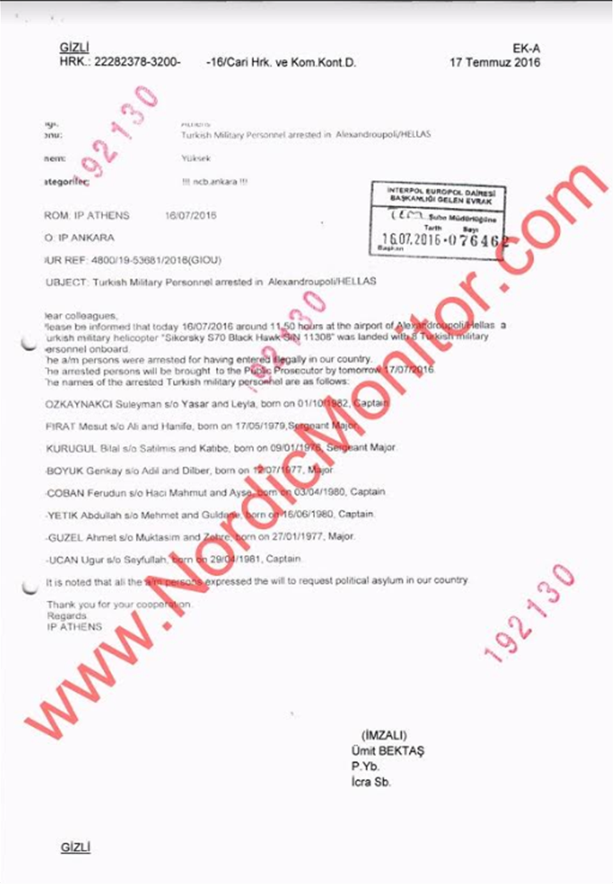 Σύμφωνα με τα εμπιστευτικά έγγραφα που δημοσιοποιήθηκαν το Γενικό Επιτελείο της Τουρκίας διαβίβασε εντολές στις Διοικήσεις των Χερσαίων Δυνάμεων και στις αεροπορικές μονάδες στις 16 Ιουλίου 2016 στις 16:15, δίνοντάς τους εντολή να εκτελέσουν ένα σχέδιο για να φέρουν το ελικόπτερο και τους οκτώ Τούρκους αξιωματικούς πίσω, από Ελλάδα.