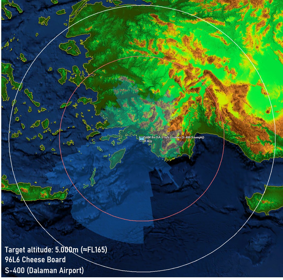 Με τον κόκκινο κύκλο απεικονίζεται η εμβέλεια των βλημάτων του S-400, η οποία όμως αναγκαστικά θα επηρεαστεί από τις αντίστοιχες ικανότητες του ραντάρ, σε σχέση με το ύψος πτήσης του στόχου.