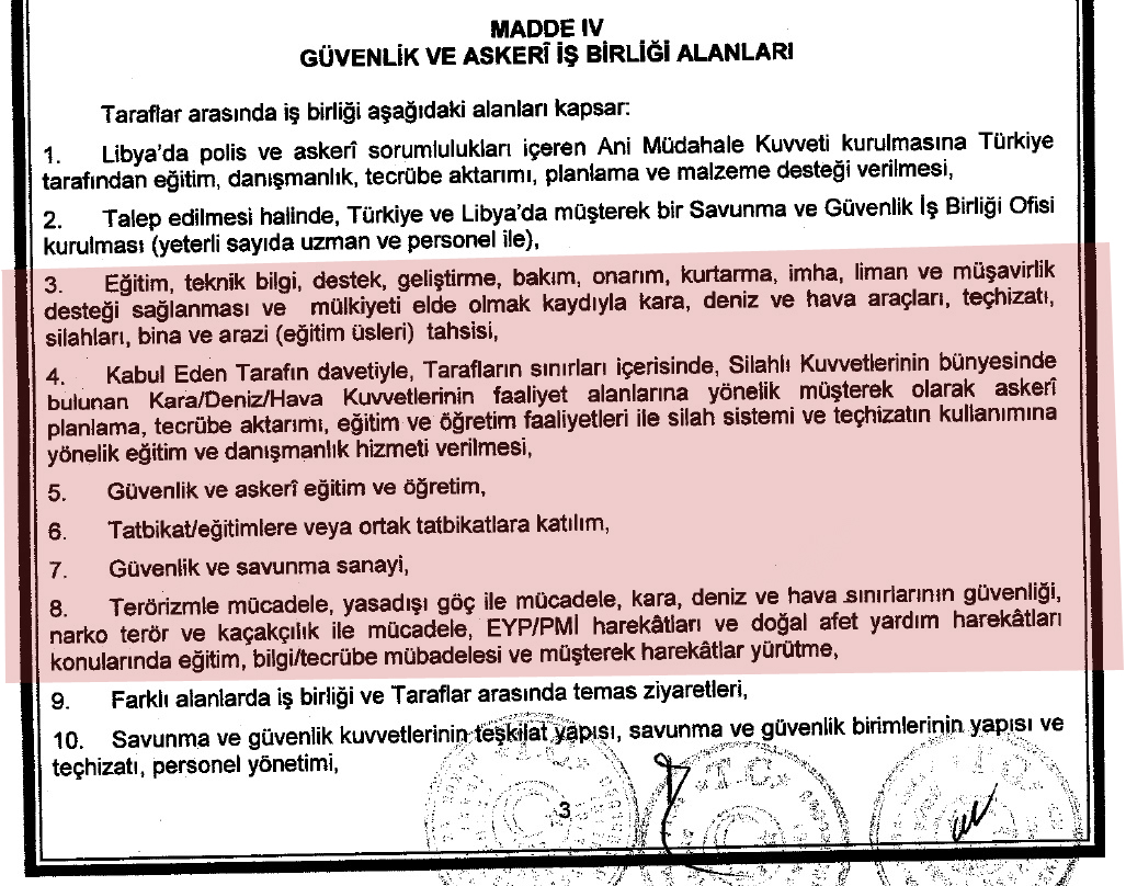 Ηδη μέσα στην συμφωνία στρατιωτικής συνεργασίας που δημοσιοποιήθηκε, δίνεται η δυνατότητα στην Τουρκία να αναπτύξει Δύναμη Ταχείας Επέμβασης, να κινούνται τα σκάφη της ελεύθερα μέσα στα λιβυκά χωρικά ύδατα και να ίπτανται τα στρατιωτικά αεροσκάφη της (μαχητικά και μεταγωγικά) ελεύθερα μέσα στον λιβυκό εναέριο χώρο, αλλά και να αναλαμβάνουν αποστολές βάσει αιτημάτων της λιβυκής κυβέρνησης!