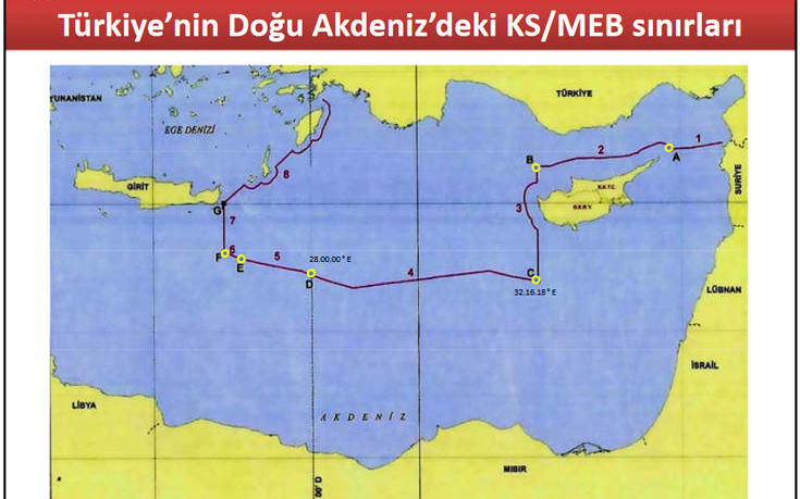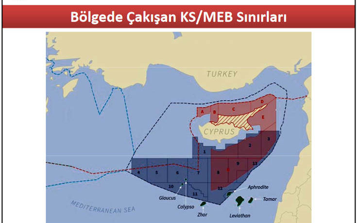 Στην επόμενη σελίδα παρουσιάζονται όλα τα τεμάχια όπως τα έχει χωρίσει η Άγκυρα καλύπτοντας όλη σχεδόν την περιοχή της ανατολικής Μεσογείου. Η υφαλοκρηπίδα/ΑΟΖ της Κύπρου και του Καστελορίζου δεν αναγνωρίζονται στο χάρτη του τουρκικού ΥΠΕΞ.