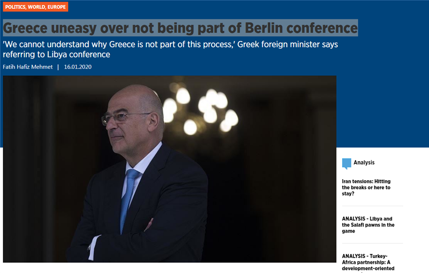 Το Anadolu, μάλιστα, χρησιμοποιεί τις αντιδράσεις της αξιωματικής -κυρίως- αντιπολίτευσης στην Ελλάδα, του ΣΥΡΙΖΑ, προκειμένου να στρέψει τις ευθύνες στην ελληνική κυβέρνηση, στην οποία εξάλλου, ο Αλέξης Τσίπρας, «χρέωσε» την απουσία της χώρας από τη διάσκεψη του Βερολίνου.