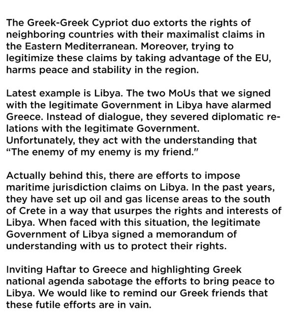 Παράλληλα, κατηγορεί την Ελλάδα και την Κύπρο ότι έχουν μαξιμαλιστικές βλέψεις στην Ανατολική Μεσόγειο και «προσπαθούν αυτές τις βλέψεις να τις νομιμοποιήσουν παίρνοντας πλεονέκτημα από το γεγονός ότι είναι μέλη της ΕΕ. Έτσι απειλούν την ειρήνη και τη σταθερότητα στην περιοχή».