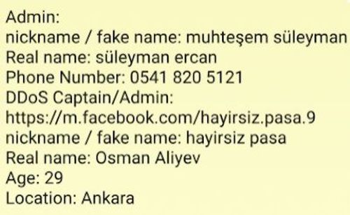 Ειδικότερα σε σχετική ανακοίνωση σημειώνουν: Όπως είπαμε σας δίνουμε παρακάτω τα πραγματικά στοιχεία των Τούρκων «χακερς», του admin των Aslan Neferler Tim και του recruiter των Anka Neferler Tim, οι οποίοι επιτέθηκαν στις ιστοσελίδες της χώρας μας.