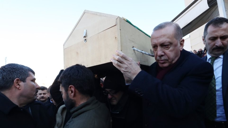 Ο πρόεδρος της Τουρκίας Ρετζέπ Ταγίπ Ερντογάν παρέστη στην κηδεία μιας μητέρας και του γιου της που έχασαν τη ζωή τους στον φονικό σεισμό των 6,8 βαθμών, στην επαρχία Ελαζίγ, στην ανατολική Τουρκία, όπου μετέβη σήμερα.