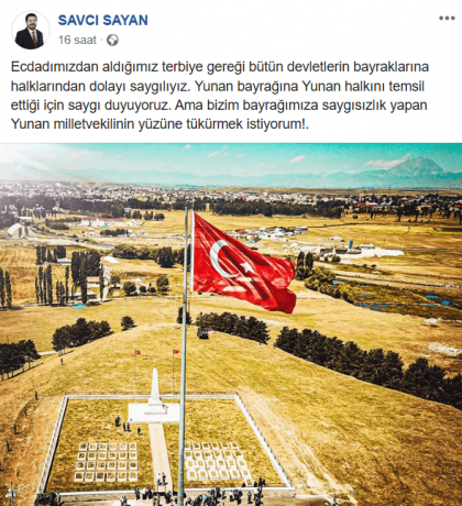 ¨Σύμφωνα με τη ευγένεια που παραλάβαμε από τους προγόνους μας, σεβόμαστε τις σημαίες όλων των κρατών λόγω των λαών τους. Σεβόμαστε την ελληνική σημαία επειδή εκπροσωπεί τον ελληνικό λαό. Αλλά θέλω να φτύσω στο πρόσωπο τον Έλληνα βουλευτή που δεν σεβάστηκε την σημαία μας¨.