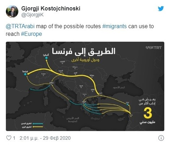 «Χάρτης με τις πιθανές διαδρομές που μπορούν να χρησιμοποιήσουν οι μετανάστες για να φτάσουν στην Ευρώπη», αναφέρει το σχετικό μήνυμα που αναρτήθηκε στο Twitter.