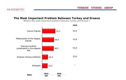 Συγκεκριμενα στο ερώτημα «Ποιο θεωρείτε πως είναι το πιο σημαντικό ζήτημα μεταξύ Ελλάδας και Τουρκίας», το 55% των συμμετεχόντων απαντά το Κυπριακό (αντίστοιχο ποσοστό για το 2019, 55,3%).