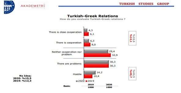 Στην ερώτηση «πως εκτιμάτε τις τουρκο-ελληνικές σχέσεις» το 30,3% -ποσοστό αμετάβλητο σε σχέση με το 2019- πιστεύει πως «υπάρχουν προβλήματα» (με το 14,2% να τις κρίνει «εχθρικές»).