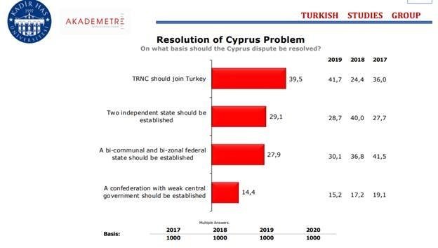 Επίσης, για το Κυπριακό το 39,5% των Τούρκων θεωρεί ότι μπορεί να επιλυθεί μέσα από την «ένωση της ΤΔΒΚ με την Τουρκία», ενώ ακολουθεί –με ποσοστό 29,1%- η επιλογή της «δημιουργίας δύο ανεξάρτητων κρατών» στην Κύπρο.