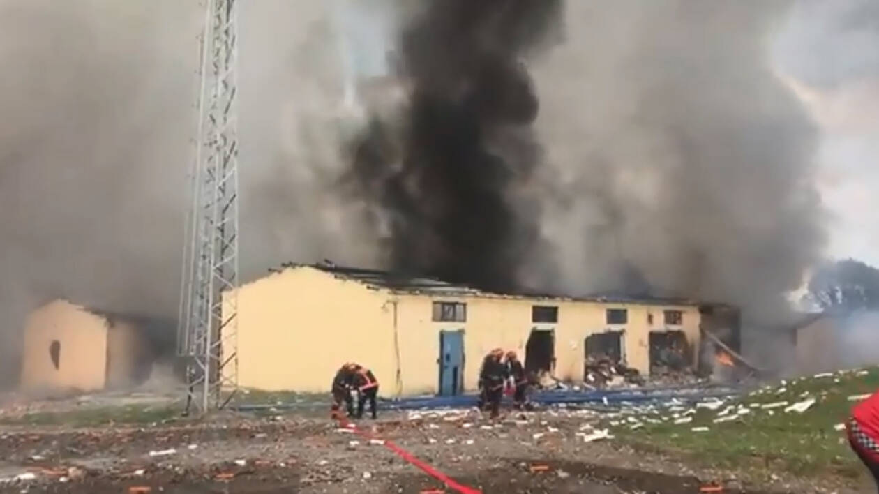 Ένα εντυπωσιακό μανιτάρι λευκού καπνού υψωνόταν πολλές εκατοντάδες μέτρα στον ουρανό ενώ πυροτεχνήματα ακούγονταν να σκάνε μέσα στο εργοστάσιο, σύμφωνα με τις εικόνες που μεταδόθηκαν από τα τουρκικά τηλεοπτικά κανάλια.