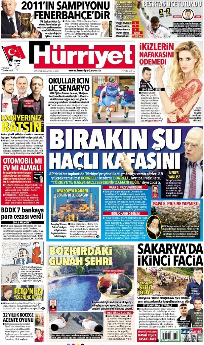 Μάλιστα η τουρκική «Χουριέτ» τον εξυμνεί σε πρωτοσέλιδο.