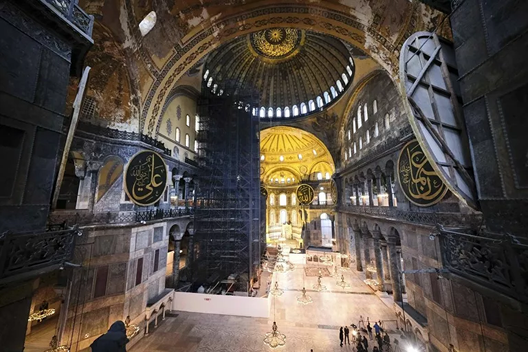 Μετά την απόφαση του ανώτατου δικαστηρίου της Τουρκίας και του Τούρκου προέδρου Ρετζέπ Ταγίπ Ερντογάν για την μετατροπή της Αγίας Σοφίας σε τζαμί, τα ψηφιδωτά και οι τοιχογραφίες στο εσωτερικό του οικουμενικού μνημείου φαίνεται πως θα καλύπτονται για τη μουσουλμανική προσευχή.