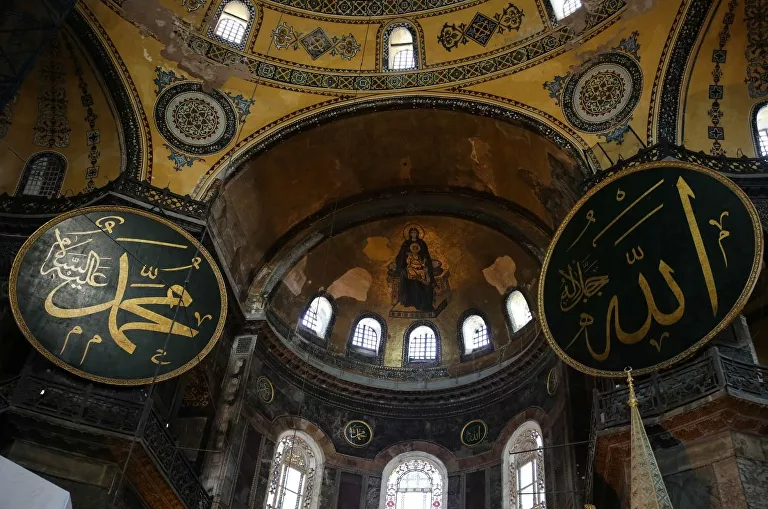 Ο εκπρόσωπος του Τούρκου προέδρου, ο Ιμπραΐμ Καλίν, προχώρησε την περασμένη εβδομάδα σε διευκρινίσεις για το πώς θα καλυφθούν τα χριστιανικά ψηφιδωτά της Αγίας Σοφίας. Σύμφωνα με τον ίδιο, τα ψηφιδωτά της Παναγίας και του Αρχάγγελου Γαβριήλ, στην κατεύθυνση δηλαδή που βλέπει στην Μέκκα και στην οποία προσεύχονται οι μουσουλμάνοι, θα καλυφθούν από κουρτίνες.