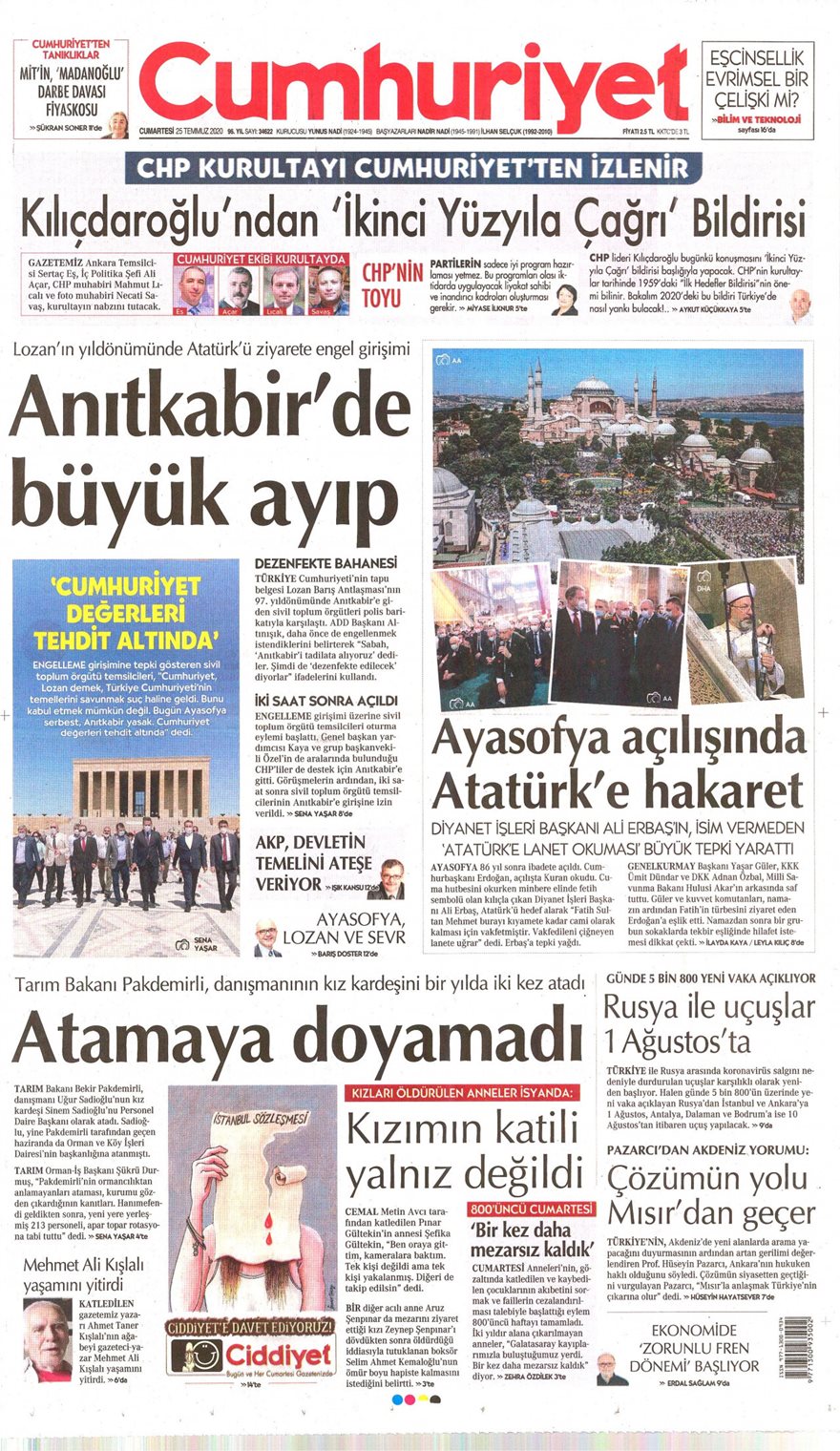 Εξαίρεση, όπως μετέδωσε η Deutsche Welle, αποτελεί η εφημερίδα Τζουμχουριέτ που στο πρωτοσέλιδο έχει τίτλο «προσβολή στον Κεμάλ», αναφερόμενη στην ομιλία του Προέδρου θρησκευτικών υποθέσεων Αλί Ερμπάς που είπε ότι όποιος άλλαξε την χρήση της Αγίας Σοφίας είναι καταραμένος.