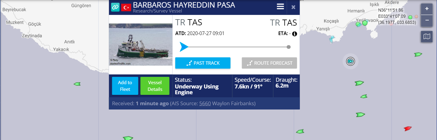 Σύμφωνα με το στίγμα του,στο marinetraffic, το Barbaros απέπλευσε από το Tasucu, ένα λιμάνι που βρίσκεται απέναντι από το Ριζοκάρπασο.