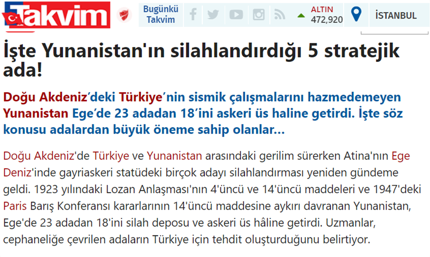Η τουρκική εφημερίδα, Takvim, σε άρθρο της με τίτλο «Αυτά είναι πέντε στρατηγικά νησιά που έχει εξοπλίσει η Ελλάδα», επαναλαμβάνει τους ισχυρισμούς της Άγκυρας περί στρατιωτικοποίησης ελληνικών νησιών του Αιγαίου.