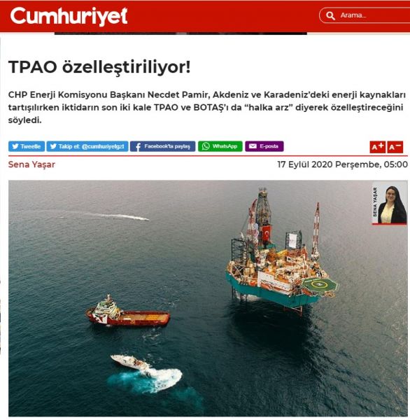 Η τουρκική εφημερίδα Cumhuriyet, έχει στο πρωτοσέλιδό της μια είδηση πως η τουρκική κυβέρνηση ετοιμάζει να ιδιωτικοποιήσει την εταιρία πετρελαίου αλλά και την εταιρία διανομής φυσικού αερίου.
