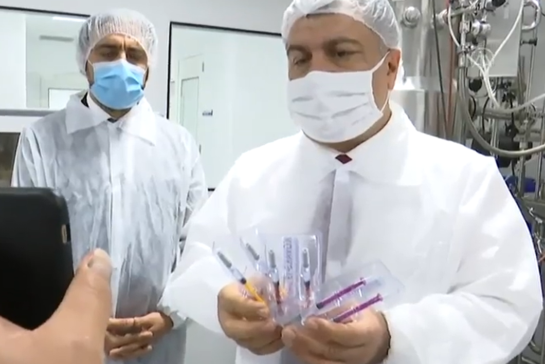Σε ένα τηλεοπτικά σκηνοθετημένο σόου, ο Τούρκος υπουργός Υγείας ενημερώνει από το εργαστήριο τον Ερντογάν στο γραφείο του, πως το τουρκικό εμβόλιο ολοκληρώνει τη φάση των κλινικών δοκιμών σε ανθρώπους.