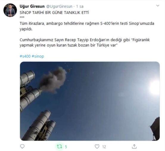 Το βίντεο το δημοσίευσε και ο πρόεδρος της τοπικής οργάνωσης του κυβερνώντος κόμματος AKP της Σινώπης, ο Uğur Giresun, στο Twitter, σημειώνοντας ότι «παρά τις αντιρρήσεις και τις απειλές για εμπάργκο, τα S-400 δοκιμάστηκαν στη Σινώπη μας», όπως σημειώνει η Γενί Ακίτ.