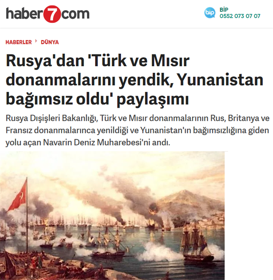 «Ρωσία : Νικήσαμε τον Οθωμανικό και Αιγυπτιακό στόλο που οδήγησε στην Ανεξαρτησία της Ελλάδας» σχολιάζει τη ρωσική κίνηση το www.haber7.com, κοινοποιώντας και την επίμαχη ανάρτηση του ρωσικού ΥΠΕΞ που προκάλεσε αίσθηση στην Τουρκία.