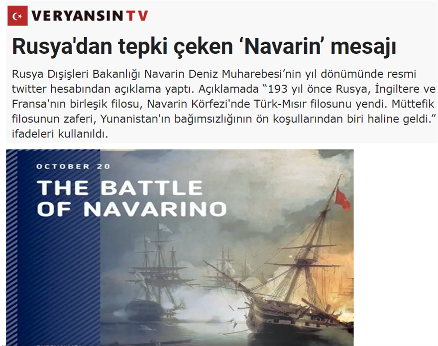 «Ρωσικό μήνυμα για το «Ναυαρίνο» προκαλεί αντιδράσεις» αναφέρει το www.veryansintv.com, αναφέροντας πως στην επίμαχη ανάρτηση επισημαίνεται πως η βύθιση του τουρκο-αιγυπτιακού στόλου στο Ναυαρίνο από τις δυνάμεις Ρωσίας, Βρετανίας και Γαλλίας οδήγησε στην ανακήρυξη της ελληνικής Ανεξαρτησίας και στην ίδρυση του σύγχρονου ελληνικού κράτους.