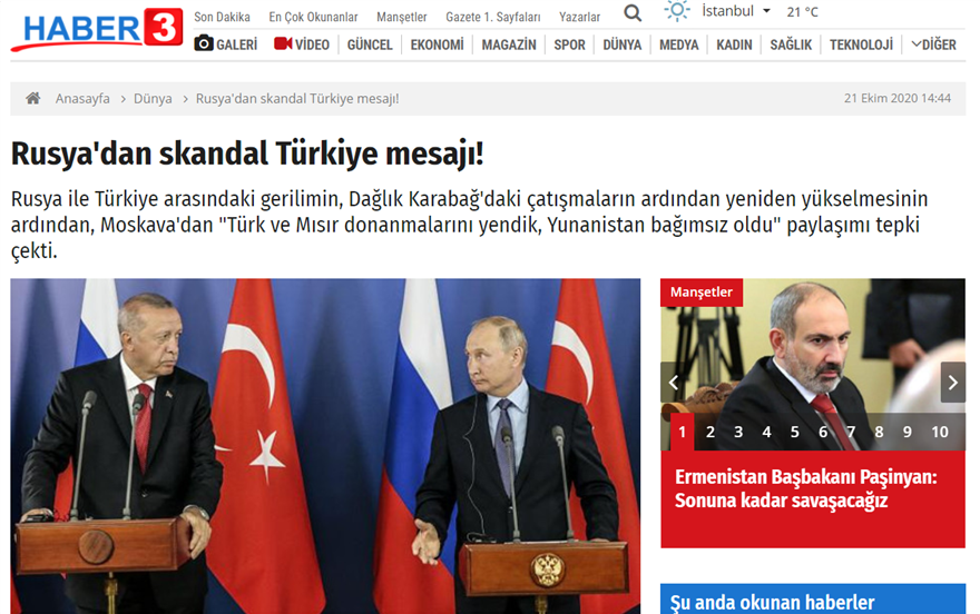 Για «σκανδαλώδες» μήνυμα της Ρωσίας προς την Τουρκία, κάνει λόγο το www.haber3.com, παρουσιάζοντας το ιστορικό της Ναυμαχίας στο Ναυαρίνο και σχολιάζοντας πως το τελευταίο διάστημα, και λόγω του Ναγκόρνο Καραμπάχ, η Μόσχα στρέφεται κατά της Άγκυρας.