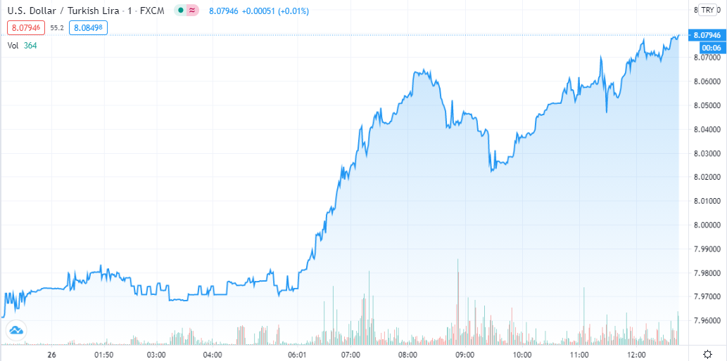 Στο παρακάτω διάγραμμα απεικονίζεται η ραγδαία επιδείνωση της ισοτιμίας του από το πρωί. (Όσο πιο ψηλά ανεβαίνει η σχέση ανταλλαγής με το δολάριο τόσο περισσότερο χάνει την αξία του το τουρκικό νόμισμα).