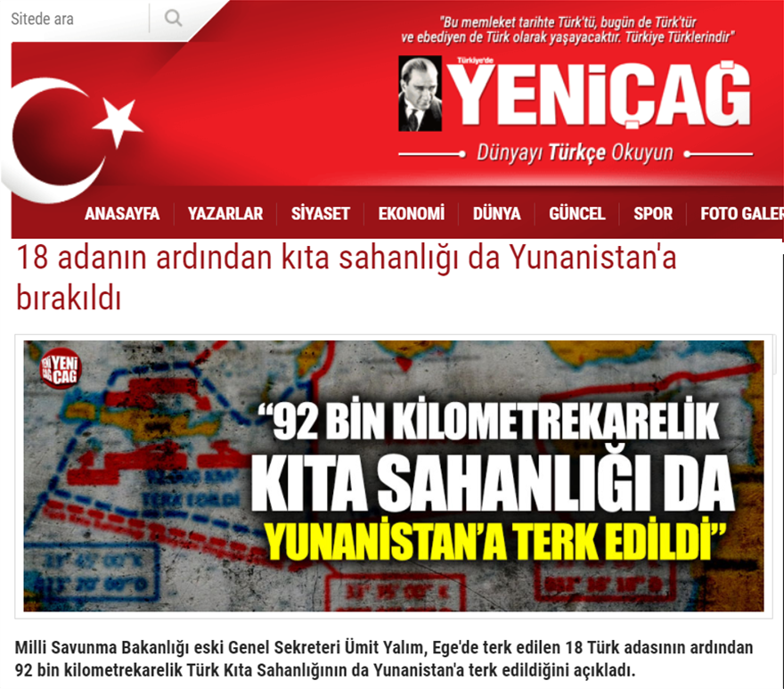 Επαναλαμβάνοντας τον ισχυρισμό του πως η χώρα μας «κατέλαβε» 18 «τουρκικά» νησιά του Αιγαίου Πελάγος, ο Γιαλίμ κατηγόρησε την Άγκυρα πως «εγκατέλειψε» υπέρ της Αθήνας 92 χιλ. τετρ. χλμ από την υφαλοκρηπίδας της, αλλά και τα ενεργειακά αποθέματα της … Θάσου.