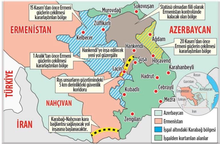 Οι ίδιοι εξηγούν ότι η πρόβλεψη, από τη συμφωνία κατάπαυσης του πυρός, διάνοιξης διαδρόμου, ο οποίος θα συνδέει το Ναχιτσεβάν οδικώς με το Αζερμπαϊτζάν, αλλάζει τα γεωπολιτικά δεδομένα της περιοχής υπέρ της Τουρκίας, σημειώνει η τουρκική εφημερίδα Μιλιέτ.
