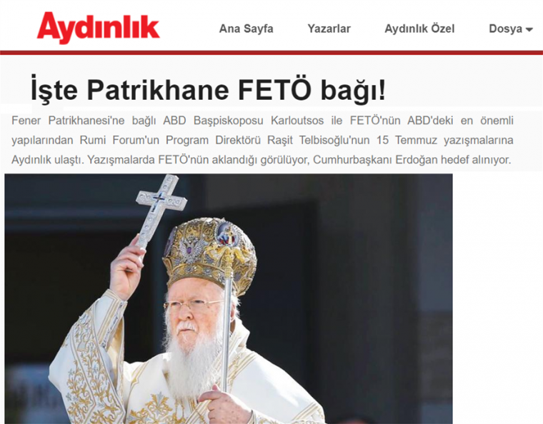 Με πρωτοσέλιδο δημοσίευμα η αντιπολιτευόμενη εθνικιστική εφημερίδα Αydinlik, προσπαθεί να εμπλέξει το Οικουμενικό Πατριαρχείο με το αποτυχημένο πραξικόπημα το 2016. «Ιδού οι δεσμός του Πατριαρχείου με τη FETO» αναφέρει ο τίτλος, σημειώνοντας πως σε αλληλογραφία μεταξύ του επισκόπου Αμερικής, Αλέξανδρου Καρλούτσου, που υπάγεται στο Πατριαρχείο Φαναρίου και του διευθύνοντα του προγράμματος Rumi Forum, Ρασίτ Τελμπίσογλου, καταβάλλεται προσπάθεια απενοχοποίησης του FETÖ και στοχοποίησης του προέδρου Ερντογάν.