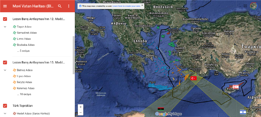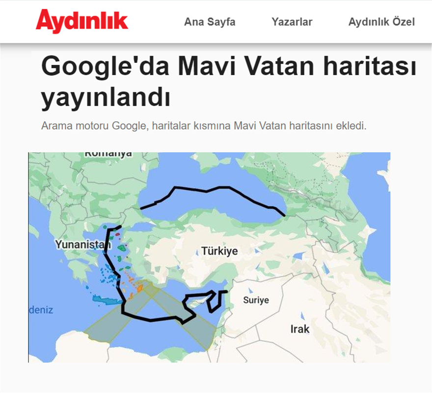 To Κέντρο Ναυτικών και Στρατηγικών Σπουδών του πανεπιστημίου Μπαχτσεσεχίρ της Κωνσταντινούπολης και ο επικεφαλής του, τέως αρχηγός του Γενικού Επιτελείου Ναυτικών Δυνάμεων, Τζιχάτ Γιαϊτζί, δημοσιοποίησαν έναν προκλητικό διαδραστικό χάρτη για την «Γαλάζια Πατρίδα», μέσω της εφαρμογής Google Maps.