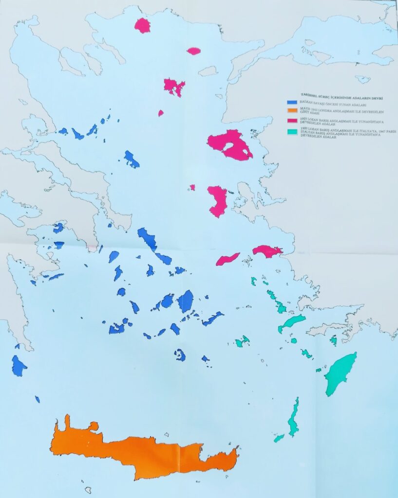 Επιπρόσθετα κυκλοφορεί χάρτες με τα νησιά τα οποία ονοματίζει και χρωματίζει ανάλογα με τις συνθήκες που τα διέπουν, σύμφωνα με την Τουρκία, η οποία λέγει πως είναι «συμβαλλόμενη» στην συνθήκη της Λωζάννης και η Ελλάδα έχει δύο επιλογές: Ή αποσύρει τα στρατεύματά της από εκεί ή θα αναγκαστεί να αντιμετωπίσει τις συνέπειες, αναφέροντας ως παράδειγμα ότι έγινε με τα Ίμια το 1996.