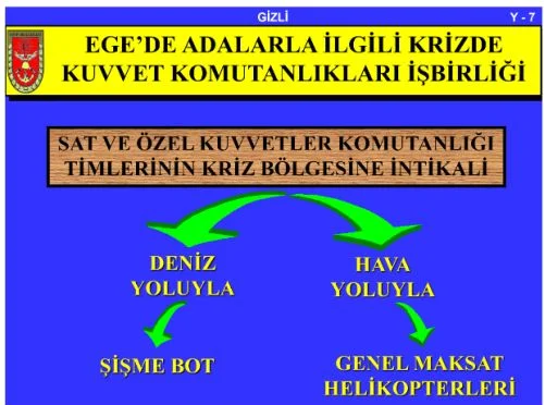 Τόσο η Διοίκηση των Ειδικών Δυνάμεων, που ελέγχεται απευθείας από το Γενικό Επιτελείο, όσο και η ελίτ των ειδικών δυνάμεων του τουρκικού ναυτικού, (SAT), θα κινητοποιούνταν χωριστά ή από κοινού από τη θάλασσα σε ταχύπλοα και στον αέρα μέσω ελικοπτέρων για τον έλεγχο των στοχοθετημένων νησιών και νησίδων.