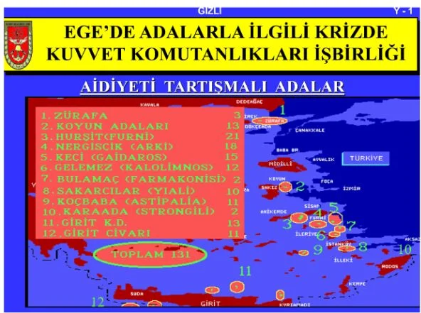 Διαφάνεια από την τουρκική παρουσίαση PowerPoint που δείχνει τον αριθμό των αμφισβητούμενων, κατά την Τουρκία, νησιών και νησίδων στο Αιγαίο