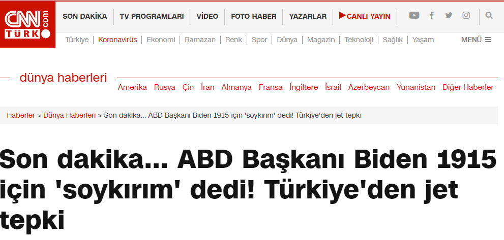 Αρκετές ιστοσελίδες της Τουρκίας παίζουν την αναγνώριση της Γενοκτονίας των Αρμενίων, ως έκτακτη είδηση, ενώ μιλούν για «σκανδαλώδεις δηλώσεις» εκ μέρους του Μπάιντεν.