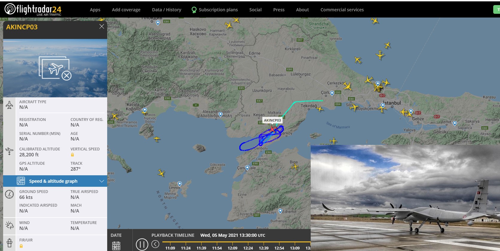 Τo UAV Akinci πέταξε στον Έβρο την Τετάρτη 5 Μαΐου και πραγματοποιούσε πτήση για τουλάχιστον τρεις ώρες.