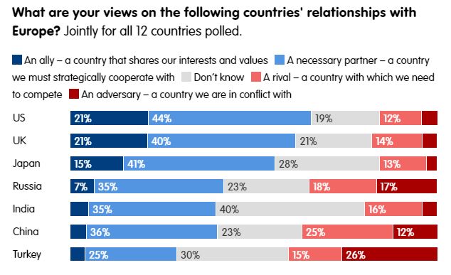 Επιπλέον η, Τουρκία είναι η μόνη χώρα που βλέπουν οι περισσότεροι Ευρωπαίοι ως αντίπαλο παρά ως ένα απαραίτητο εταίρο. Δεδομένου ότι η Τουρκία είναι μέλος του ΝΑΤΟ – σε αντίθεση με την Κίνα, τη Ρωσία, την Ινδία και την Ιαπωνία, τις οποίες όλοι οι Ευρωπαίοι θεωρούν λιγότερο απειλητικές – αυτό το εύρημα είναι αρκετά ανησυχητικό.