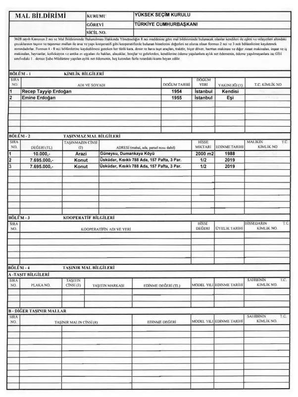 Στη συνέχεια, δόθηκε στη δημοσιότητα η δήλωση περιουσιακής κατάστασης του Τούρκου προέδρου, σύμφωνα με την οποία προκύπτει ότι οφείλει 5.390.000 τουρκικές λίρες, στον αδερφό του, Μουσταφά Ερντογάν.