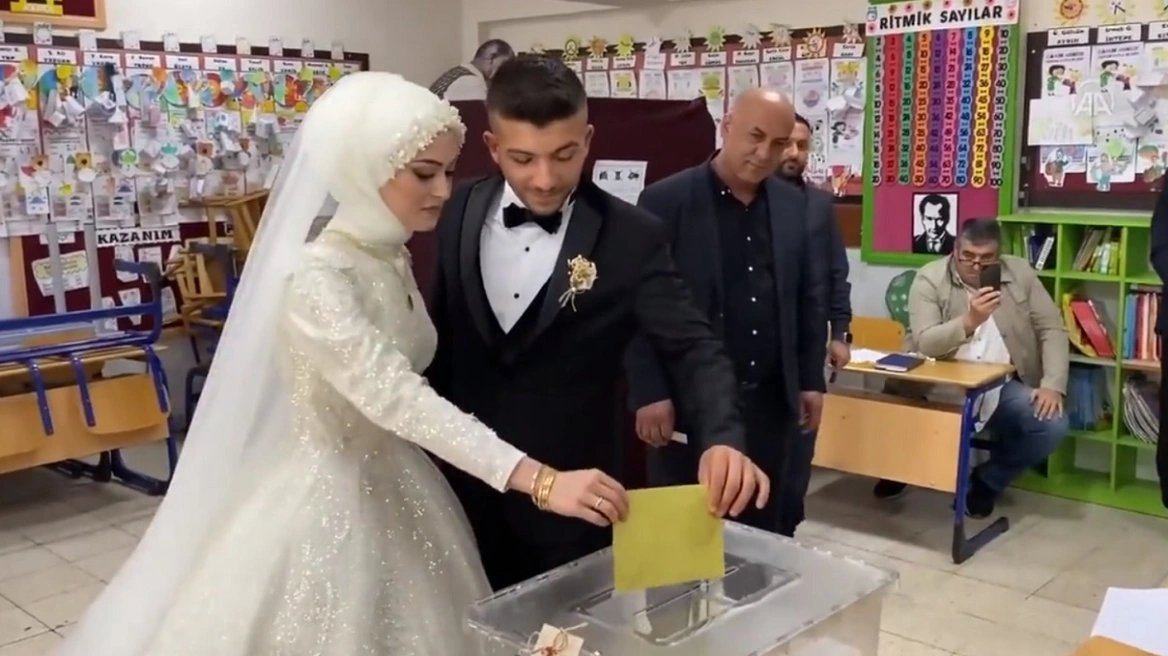 Düzce'de dünyaevine girecek bir çift, oy kullanmaya gelinlik ve damatlığıyla geldi. pic.twitter.com/m4hXlQL1Go
