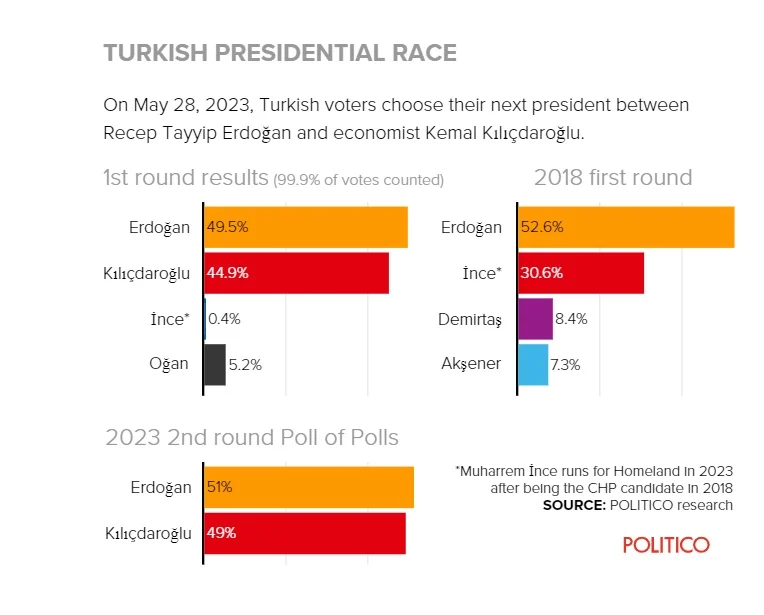 Σημειώνεται πως και το Politico δίνει νικητή τον Ερντογάν στο δεύτερο γύρο των εκλογών στην Τουρκία.