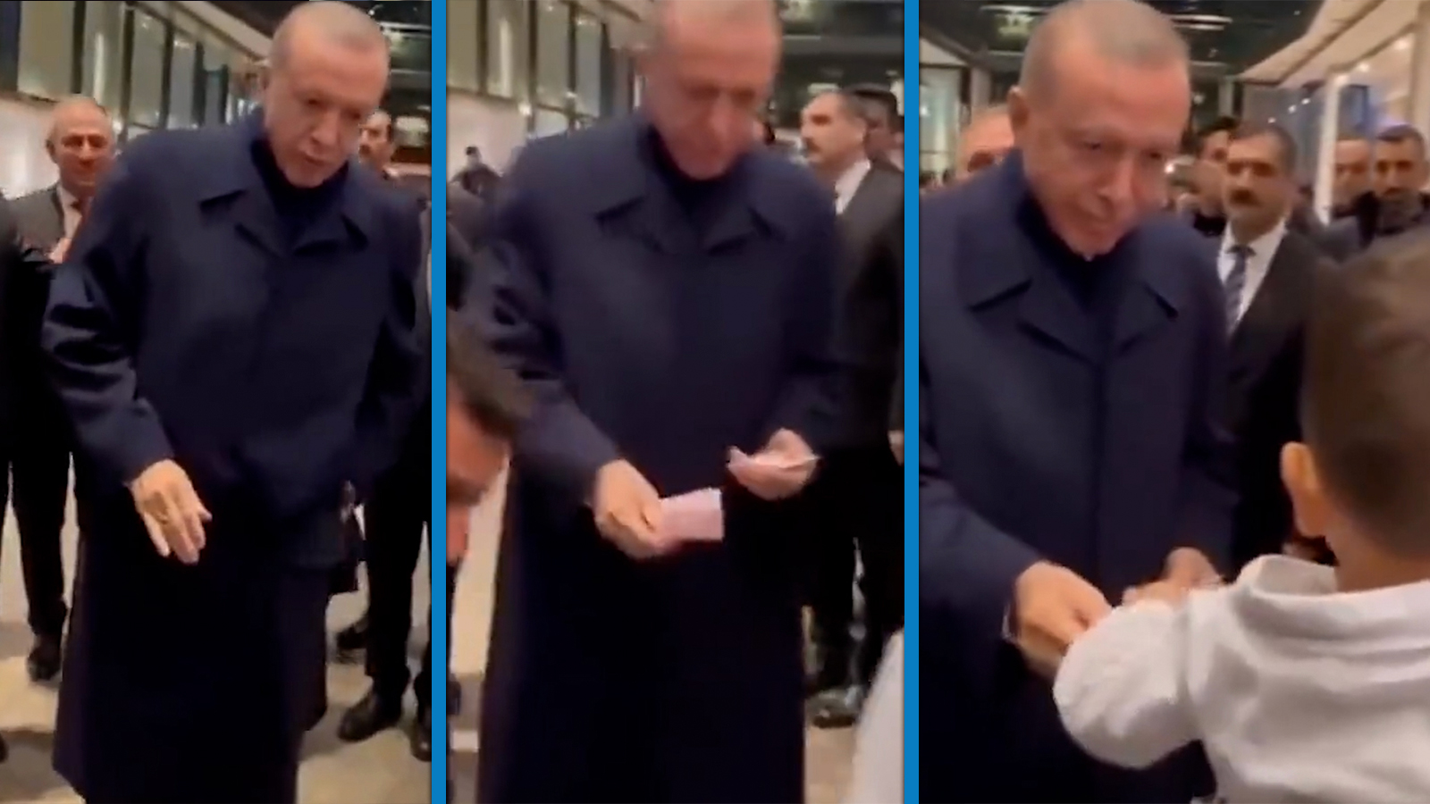 Οι κάμερες κατέγραψαν τις στιγμές που ο Τούρκος πρόεδρος  βγάζει  μια δεσμίδα με τουρκικά χαρτονομίσματα από την τσέπη του και τα μοιράζει στα παιδιά των Τούρκων μεταναστών που τον υποδέχθηκαν.