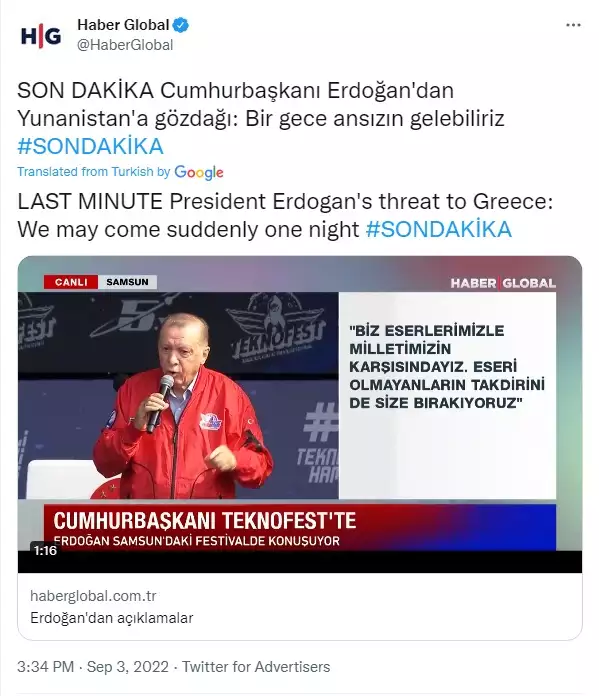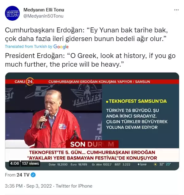 Ο Τούρκος Πρόεδρος Ρετζέπ Ταγίπ Ερντογάν, μιλώντας σε φεστιβάλ τεχνολογίας, επανέλαβε για ακόμη μία φορά όσα έχει πει κατά της Ελλάδας το τελευταίο διάστημα.