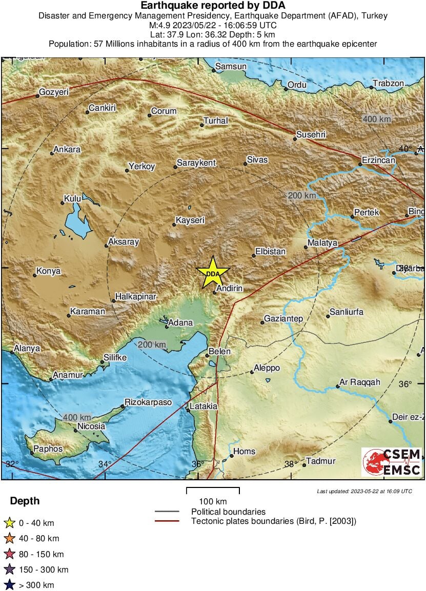 Σύμφωνα με το Ευρωμεσογειακό σεισμολογική ινστιτούτο το επίκεντρο της δόνησης ήταν 64 χλμ Δυτικά – Βορειοδυτικά του Καχραμανμάρας.