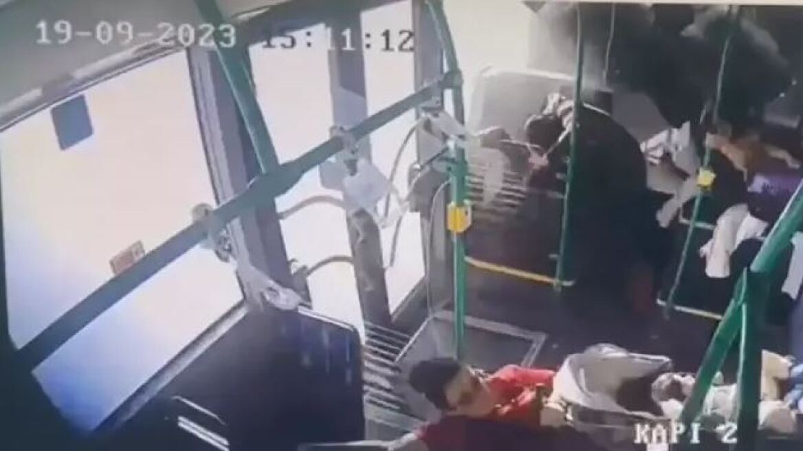 Κάμερα ασφαλείας μέσα από το λεωφορείο έχει καταγράψει τη στιγμή του τροχαίου με τους επιβάτες να «πετάνε» στον αέρα από την εκτός ελέγχου πορεία του οχήματος.