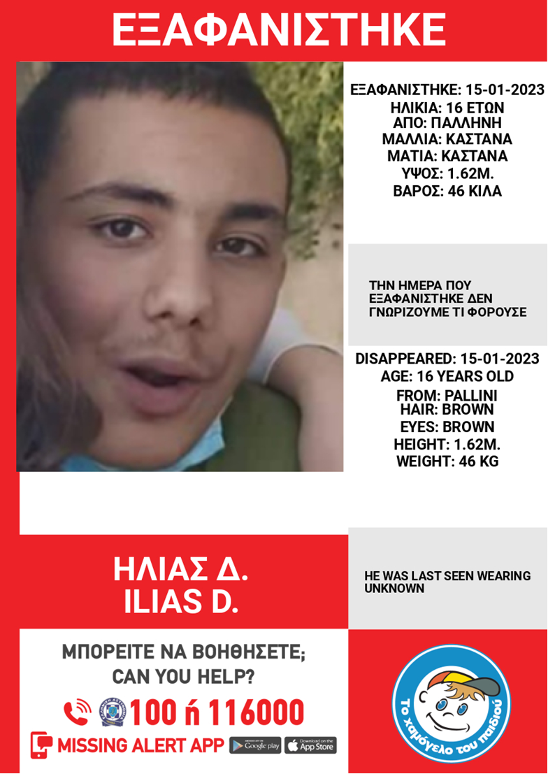 τις 15.01.2023, απογευματινές ώρες, εξαφανίστηκε από την περιοχή της Παλλήνης, ο ανήλικος Ηλίας Δ. 16 ετών.