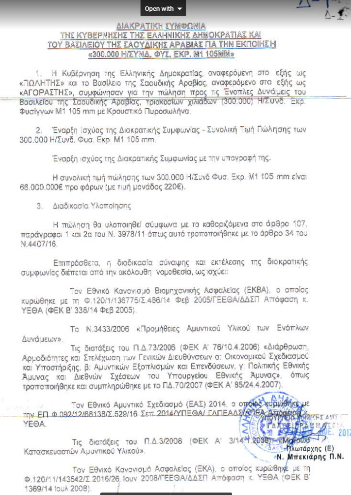 Διακρατική Συμφωνία της Κυβέρνησης της Ελληνικής Δημοκρατίας και του Βασιλείου της Σαουδικής Αραβίας για την Εκποίηση «300.000 Η/ΣΥΝΔ.ΦΥΣ. ΕΚΡ. Μ1 105 ΜΜ» (Δ-1).