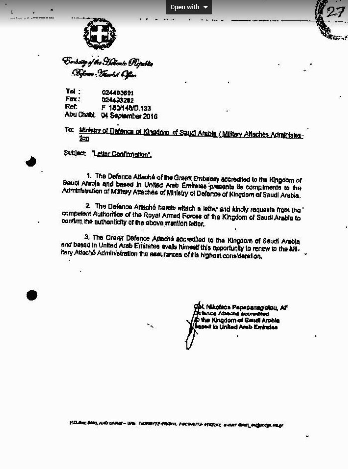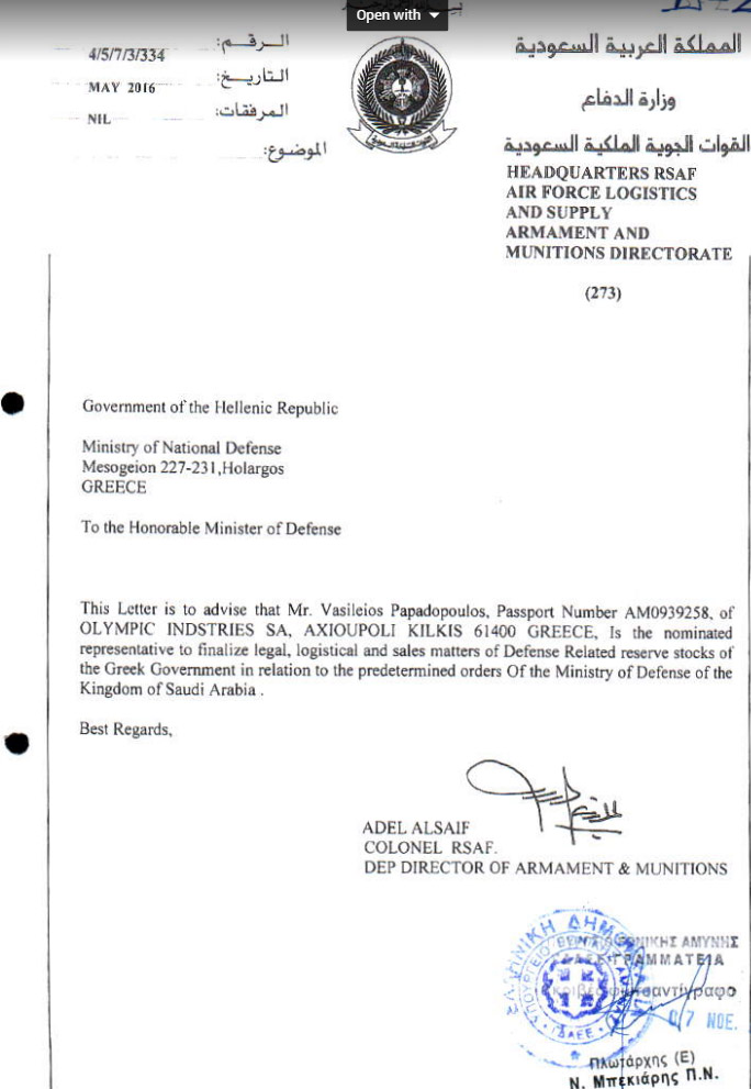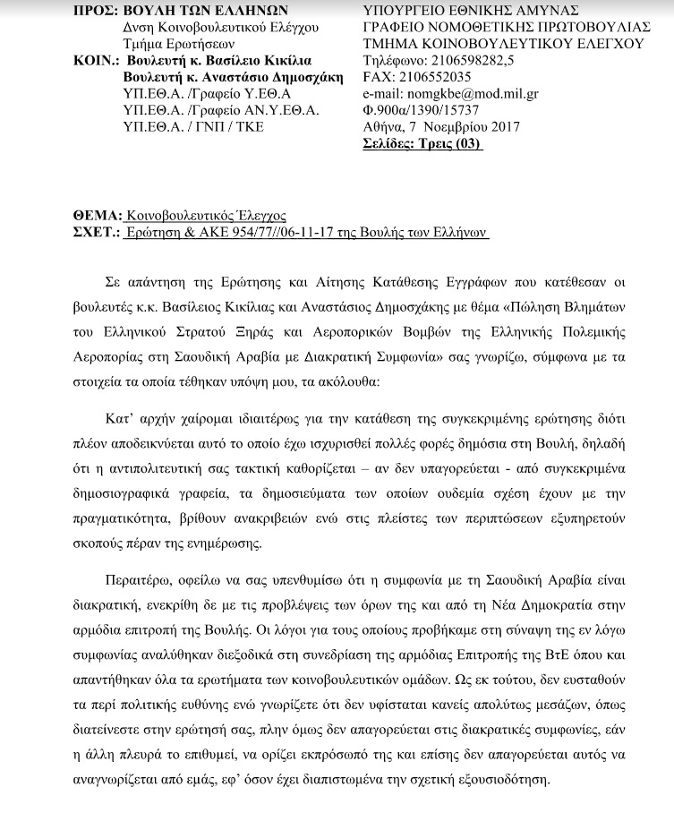 Σε απάντηση της Ερώτησης και Αίτησης Κατάθεσης Εγγράφων που κατέθεσαν oι βουλευτές κ.κ. Βασίλειος Κικίλιας και Αναστάσιος Δημοσχάκης με θέμα «Πώληση Βλημάτων του Ελληνικού Στρατού Ξηράς και Αεροπορικών Βομβών της Πολεμικής Αεροπορίας στη Σαουδική Αραβία με Διακρατική Συμφωνία» ο υπουργός Εθνικής Άμυνας κατέθεσε τα παρακάτω έγγραφα: