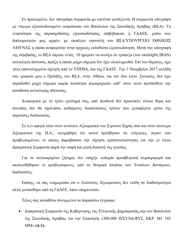 Πιο συγκεκριμένα ο υπουργός Εθνικής Άμυνας δήλωσε ότι η συμφωνία για την πώληση βλημάτων των 105 χλστ. στη Σαουδική Αραβία είναι διακρατική και ο Βασίλειος Παπαδόπουλος είναι πλήρως εξουσιοδοτημένος εκπρόσωπος του Βασιλείου και όχι μεσάζων.