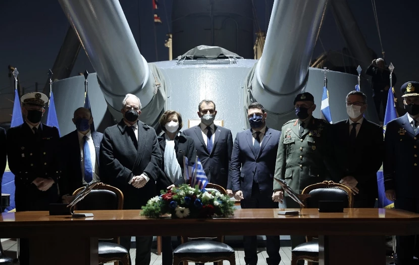 Στο κατάστρωμα του θωρηκτού «Αβέρωφ», στη Μαρίνα Φλοίσβου, υπογράφηκαν οι συμβάσεις απόκτησης 3 γαλλικών φρεγατών Belh@rra από το Πολεμικό Ναυτικό και των 6 επιπλέον Rafale που προστέθηκαν στην αρχική παραγγελία των 18 αεροσκαφών για την Πολεμική Αεροπορία.